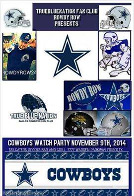 Attention All Dallas Cowboys Fans TrueBlueNation Fan Club and Rowdy Row as we watch our Dallas Cowboys take on the Jacksonville Jaguars Sunday November 9th, 2014 at Tailgaters Sports Bar and Grill in Frisco,Texas. There will be food and drink specials.
